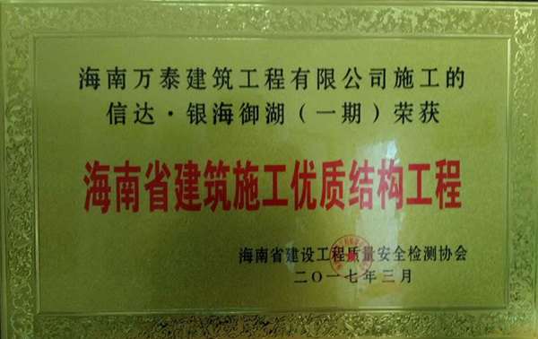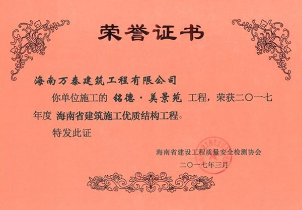 2017年6月20日,經過了長期的嚴格評審之后,由海南萬泰承建的海口市人民醫院綜合保障樓、瓊海信達銀海御湖(一期)、銘德.美景苑三個項目全部通過基礎、主體階段的評審,并榮獲海南省建設工程質量安全檢測協會頒發的《海南省建筑施工優質結構工程》證書。至此,繼“藍城商務大廈 ”榮獲“椰城杯”后,萬泰工程再斬殊榮。值得一提的是,這已經是萬泰本年度第三次榮獲相關獎項。
