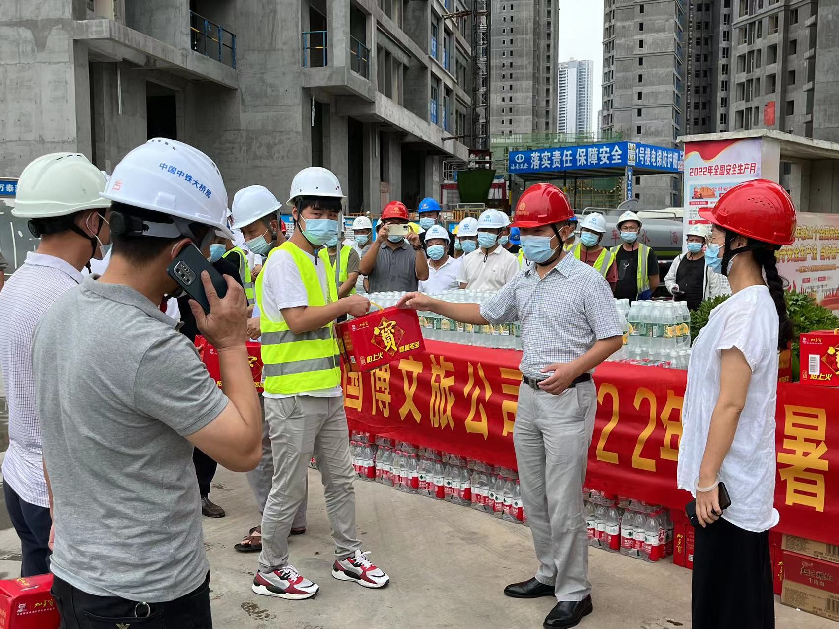 活動上,武漢國博文旅副總經理江立偉對在炎熱天氣里仍然堅守在一線崗位上的廣大工友們表示慰問和感謝,并叮囑大家注意防暑降溫,提高防范意識,保護好自身安全。同時要求所有項目管理人員關心工地一線工人的身體健康,認真做好防暑降溫工作,嚴格落實各項安全生產措施,確保安全生產工作有條不紊。
