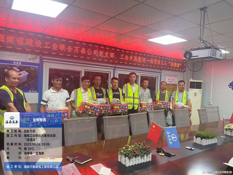 為深入貫徹落實(shí)習(xí)近平新時(shí)代中國(guó)特色社會(huì)主義思想,切實(shí)做好高溫天氣防暑降溫工作,保障一線項(xiàng)目工人的身體健康,確保安全文明施工,9月5日,在省建設(shè)工會(huì)的關(guān)心和支持下,海南萬(wàn)泰建筑工程有限公司到公司承建的瓊海金輝雅苑、永成·和悅府項(xiàng)目部開展了慰問(wèn)一線項(xiàng)目工人“送清涼”活動(dòng)。公司黨支部、工會(huì)、總經(jīng)辦、工程部以及項(xiàng)目負(fù)責(zé)人、一線工人等參加本次活動(dòng)。