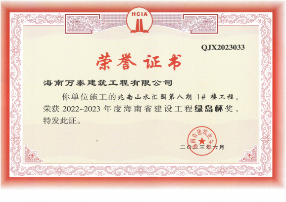 金秋九月,碩果累累。近日,海南萬泰建筑工程有限公司承建的兆南·山水匯園第八期1#樓項目喜獲海南省住房和城鄉建設廳2022-2023年度海南省建設工程“綠島杯”獎!