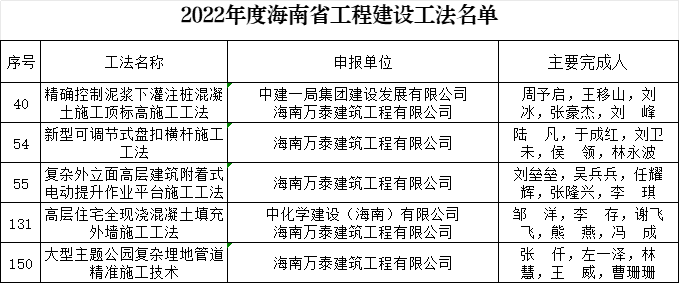 近日,由海南萬泰建筑工程有限公司申報的《大型主體公園復雜埋地管道精準施工技術》《復雜外立面高層建筑附著式電動提升作業平臺施工工法》《高層住宅全現澆混凝土填充外墻施工工法》《精確控制泥漿下灌注樁混凝土施工頂標高施工工法》《新型可調節式盤扣橫桿施工工法》共5項省級工法通過省住建廳評審,并頒發了相應省級工法證書。據悉,這5項省級工法是公司的個別工程項目經過實踐總結出來的技術成果,具有良好的安全性、經濟性和適用性,可提高工效、縮短工期、大幅降低工程成本。此次通過的省級工法,是萬泰在工程施工技術方面的重大創新,后續我司將廣泛推廣至各工程項目中加以應用。