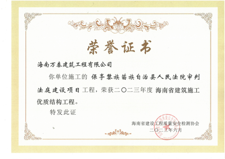 近日,由公司承建的育才醫院建設項目一期、保亭黎族苗族自治縣人民法院審判法庭建設項目、亨通·南湖花園分別通過了海南省建設工程質量安全檢測協會的評審,被評為“2023年度海南省建筑施工優質結構工程”。該獎項代表著全省建筑工程結構施工質量的領先水平,是精品工程的重要標志。