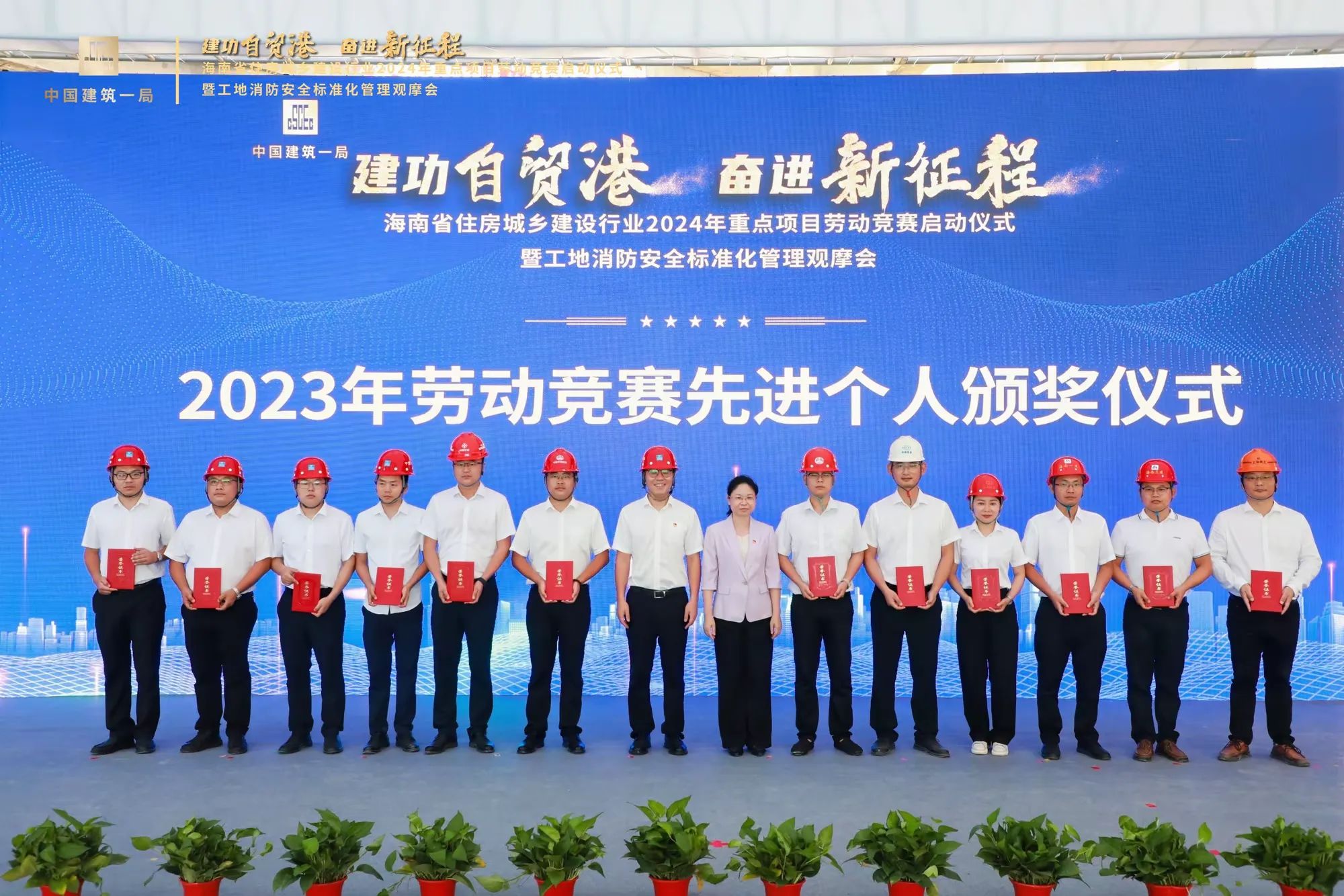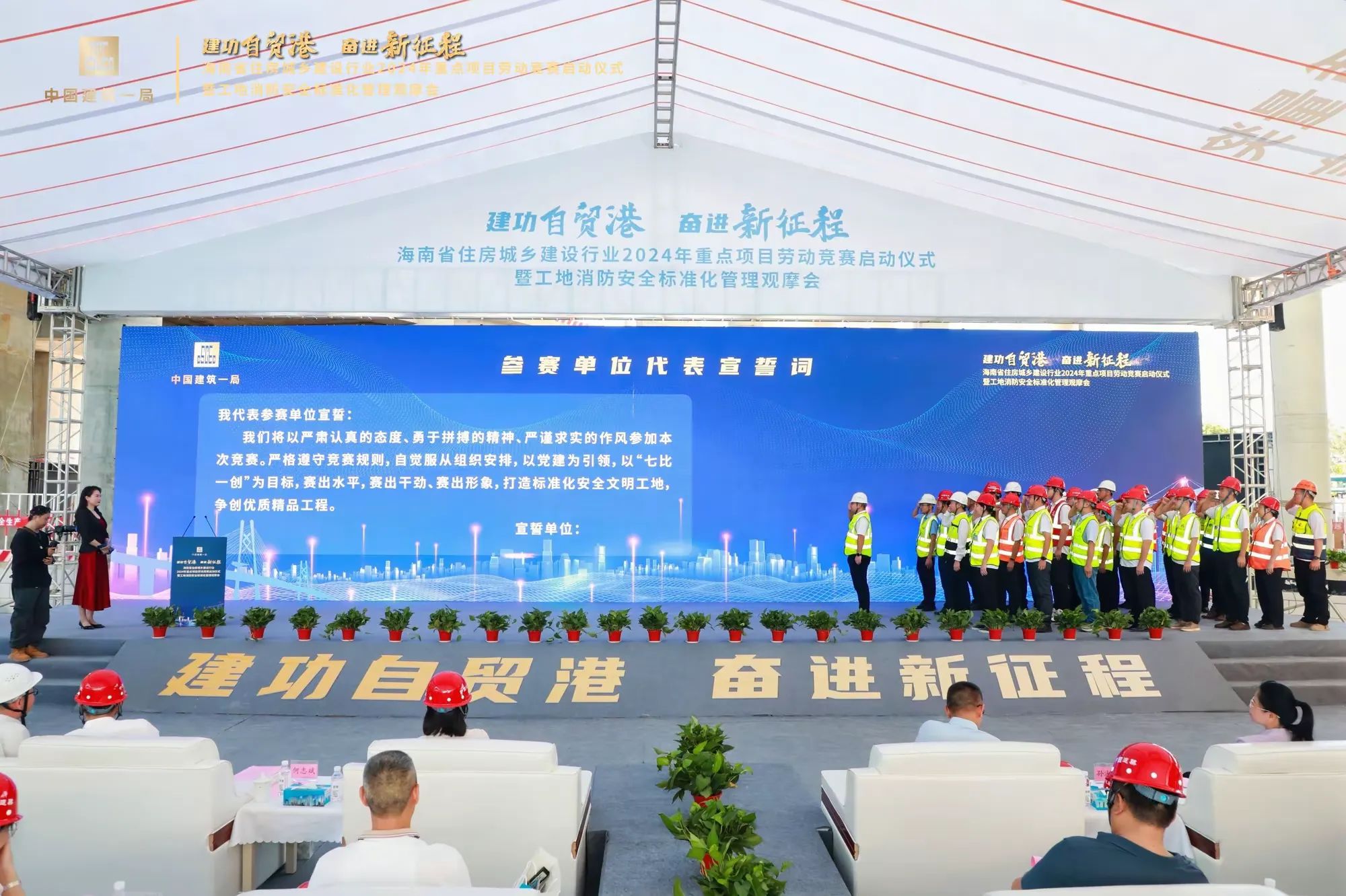 在啟動(dòng)儀式現(xiàn)場(chǎng),公司林慧同志作為29名海南省住房城鄉(xiāng)建設(shè)行業(yè)2023年重點(diǎn)項(xiàng)目勞動(dòng)競(jìng)賽“先進(jìn)個(gè)人”之一上臺(tái)領(lǐng)獎(jiǎng),張豪杰同志作為公司代表上臺(tái)進(jìn)行參賽單位宣誓。本次勞動(dòng)競(jìng)賽以“七比一創(chuàng)”為主要內(nèi)容,即“比黨建引領(lǐng)、比工程進(jìn)度、比工程質(zhì)量、比安全生產(chǎn)、比科學(xué)管理、比技術(shù)創(chuàng)新、比文明施工、創(chuàng)優(yōu)質(zhì)工程”,進(jìn)一步激發(fā)廣大職工不斷提升自身能力水平,勇于奉獻(xiàn)、干事創(chuàng)業(yè)的熱情。