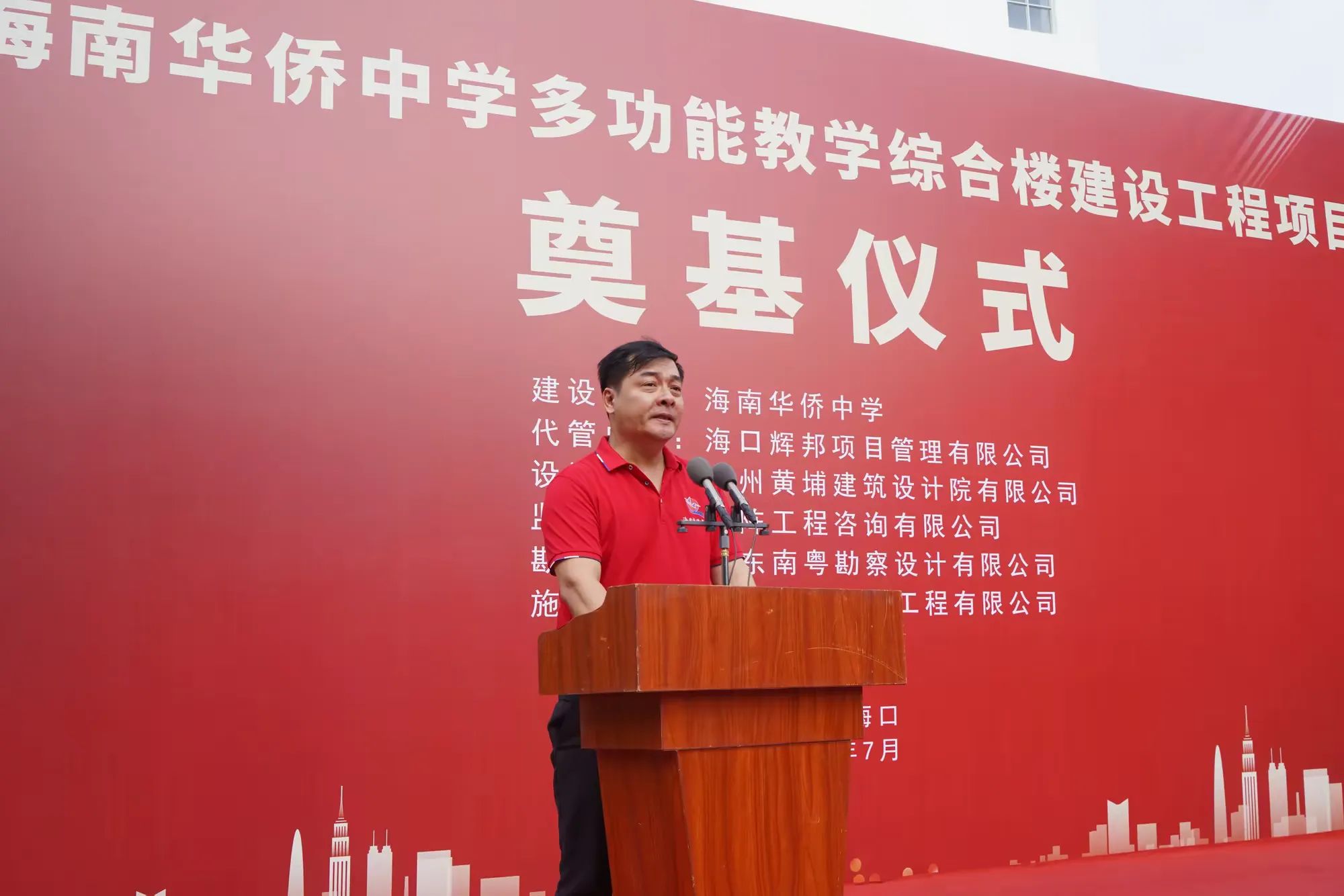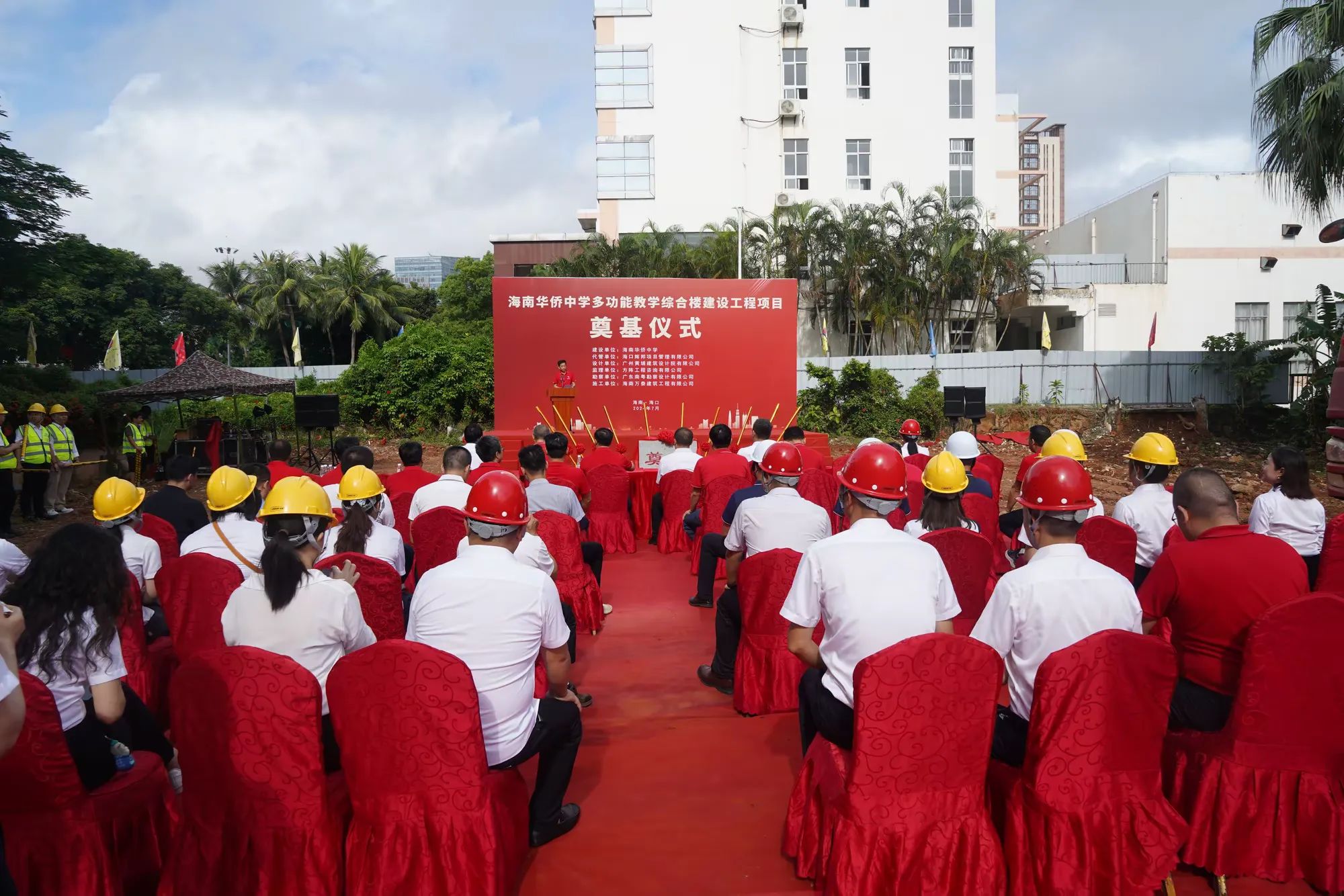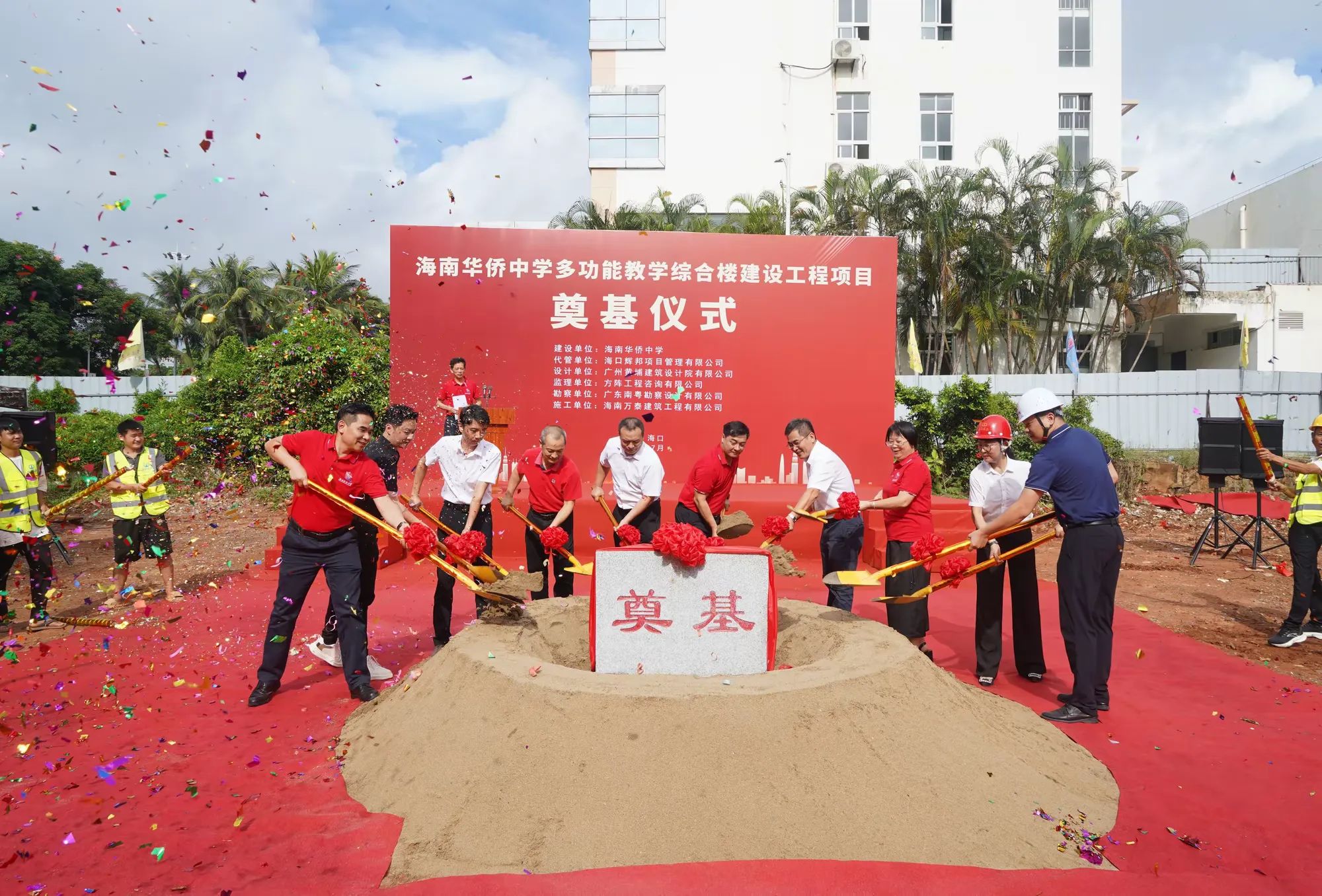 七月綠意爭相艷,書生意氣冠瓊州。7月19日,由海南萬泰建筑工程有限公司承建的海南華僑中學多功能教學綜合樓建設工程項目舉行開工儀式。海口市發改委黨組成員、副主任莊華東,海南華僑中學黨委副書記、校長張偉,黨委委員、副校長吳撼宇,海口市城投集團黨委副書記、董事、總經理孫傳志以及代管、監理、施工單位相關人員參加了本次活動。儀式由海南華僑中學副校長吳澤純主持。