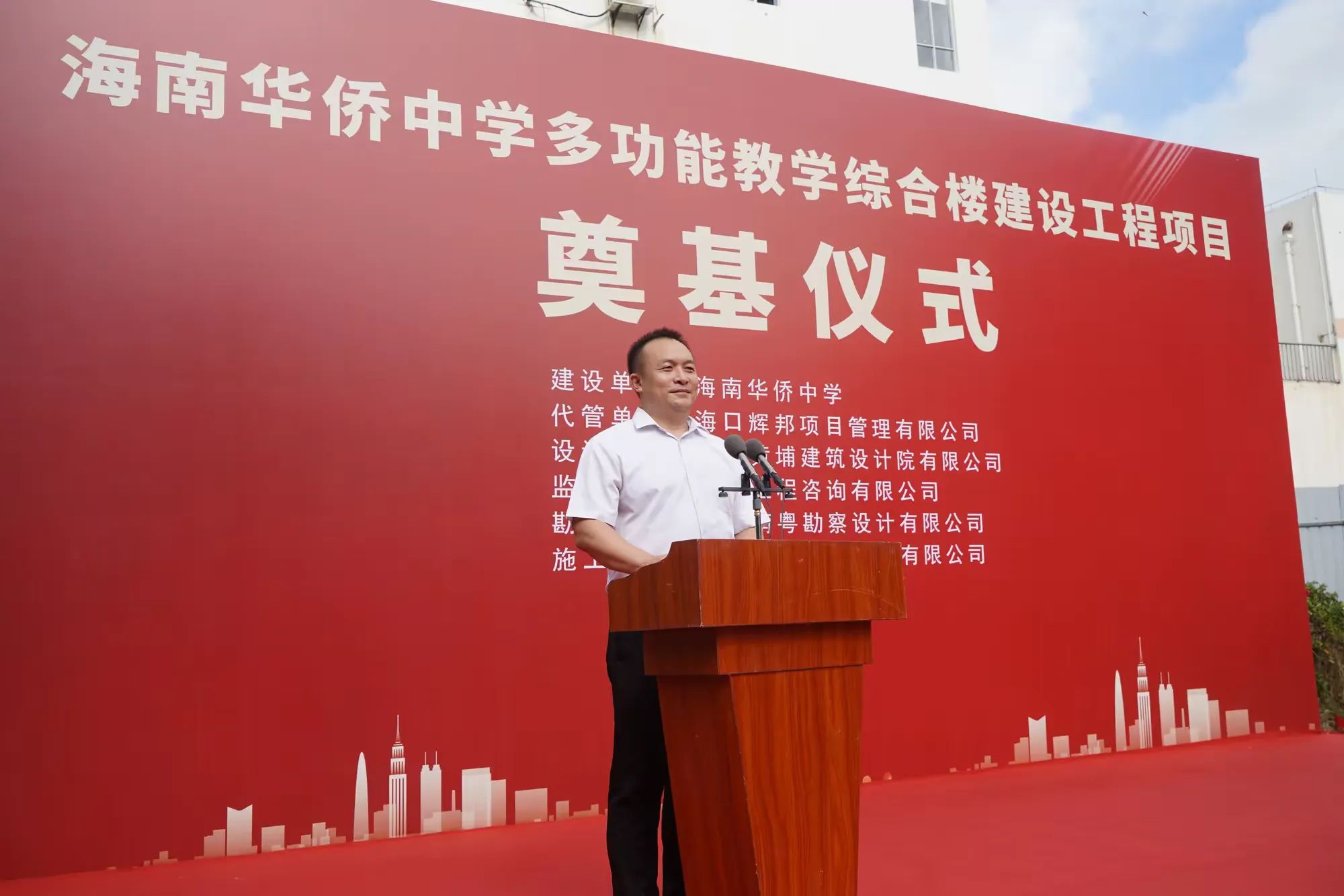 在開工儀式上,海南華僑中學黨委副書記、校長張偉在講話中指出百年大計,質量第一。施工單位要嚴格按照設計要求和施工標準,精心組織,科學施工,監理單位要認真履行職責,嚴格把關,高標準質檢,一定要確保工程質量和安全。各參建單位要嚴格、認真履職,齊心協力、高效協同、攻堅克難,為廣大師生提供一個教學設備更加先進,教學設施更為完善,學習環境更為優美的學習場所。