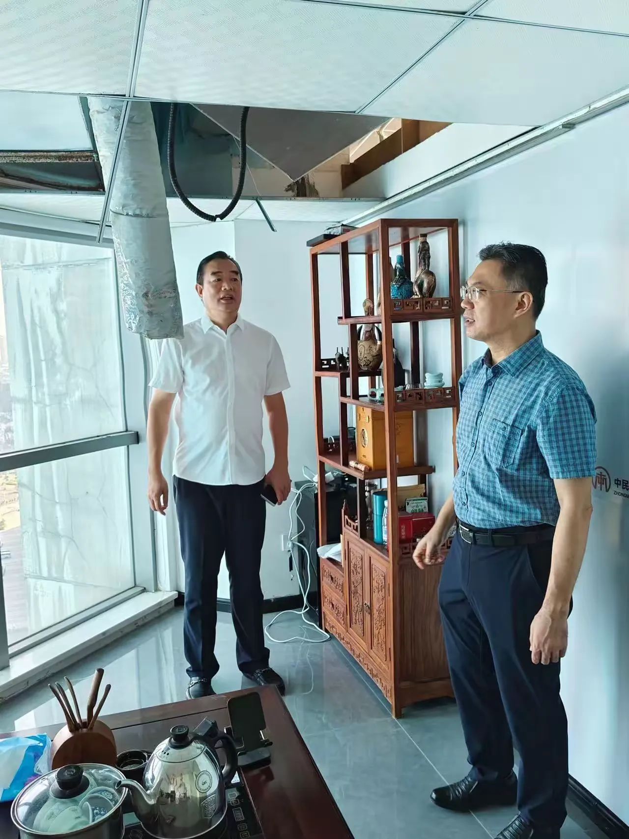 林青主委一行在公司總經理顏利的帶領下查看了公司幾個因臺風“摩羯”而受損的辦公區域。在調研座談會上,公司總經理顏利通過PPT圖片形式向林青主委一行介紹了本次受災受損情況,企業辦公區域積水、滲水嚴重,吊頂脫落、玻璃吹碎、設備損壞,多個項目部及工人生活區板房被吹塌、設備及電箱圍墻等受到嚴重破壞。顏利總表示,上述問題給企業造成了巨大的經濟損失,嚴重影響了復工復產的進度,請各級政府部門能夠給予廣大企業更多的關懷和幫助,出臺政策及措施助力企業走出困境。