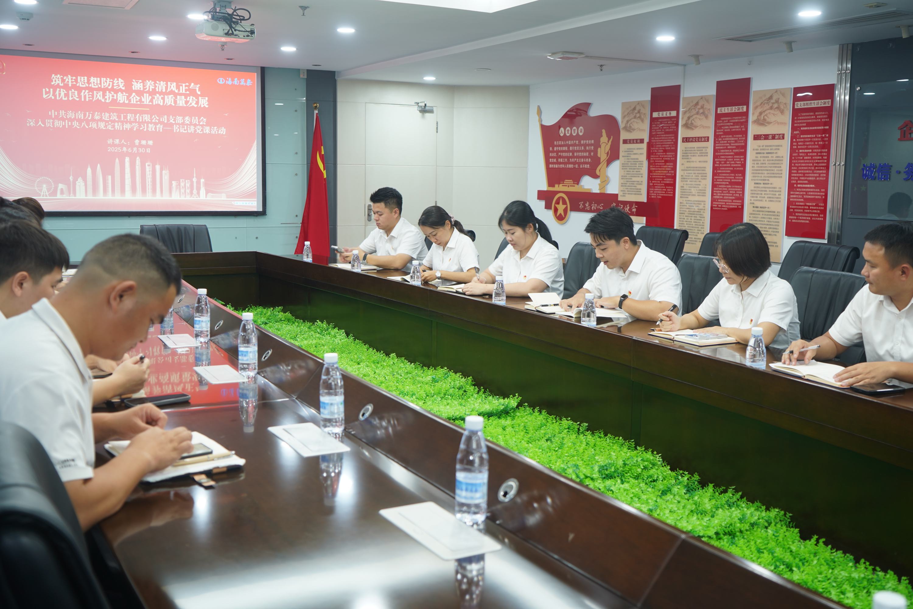 為深入貫徹中央八項規定精神學習教育,引導黨員干部學深悟透,6 月 30 日下午,海南萬泰公司黨支部在黨建會議室組織開展了深入貫徹中央八項規定精神學習教育暨書記講黨課活動。本次會議由黨支部書記曹珊珊主持,旨在進一步強化黨員干部的作風建設,推動公司高質量發展。支部黨員及入黨積極分子參加了本次活動。
