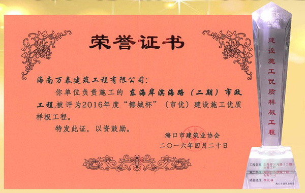 2016年4月,由公司承建的“東海岸濱海路(二期)”工程,榮獲2016年度“椰城杯(市優)建設施工優質樣板工程”。