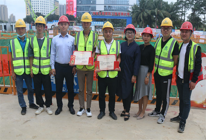 3月25日上午,根據公司安排,黨支部、工會前往省政務中心項目工地現場,為參加省人力資源開發局聯合省建設工會主辦的“2020年海南省行業職業技能競賽---建筑行業職業技能競賽”并獲得砌筑二等獎、三等獎的周宗清、李業倫頒發榮譽證書、高級工職業資格證書和現金獎勵。