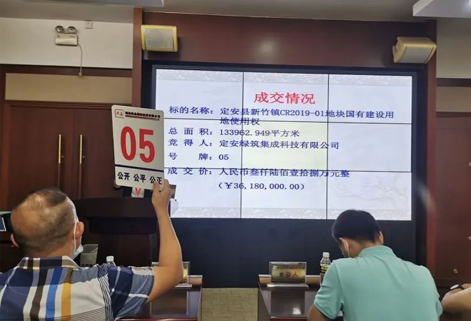 2020年4月17日上午8:30,海南綠筑裝配式產業基地項目成功摘牌,該項目位于定安縣新竹鎮中線高速公路東側,土地性質為二類工業用地,占地面積200.94畝,總投資6億元。