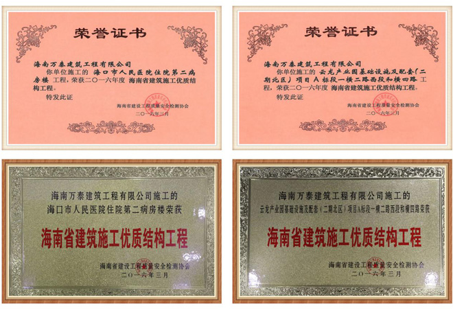 2016年3月,由海南萬泰建筑工程有限公司承建的“海口市人民醫(yī)院住院第二病房樓”及“云龍產(chǎn)業(yè)園基礎設施及配套(二期)項目”工程被海南省建設工程質(zhì)量安全檢測協(xié)會評為《海南省建筑施工優(yōu)質(zhì)結(jié)構工程》榮譽稱號。